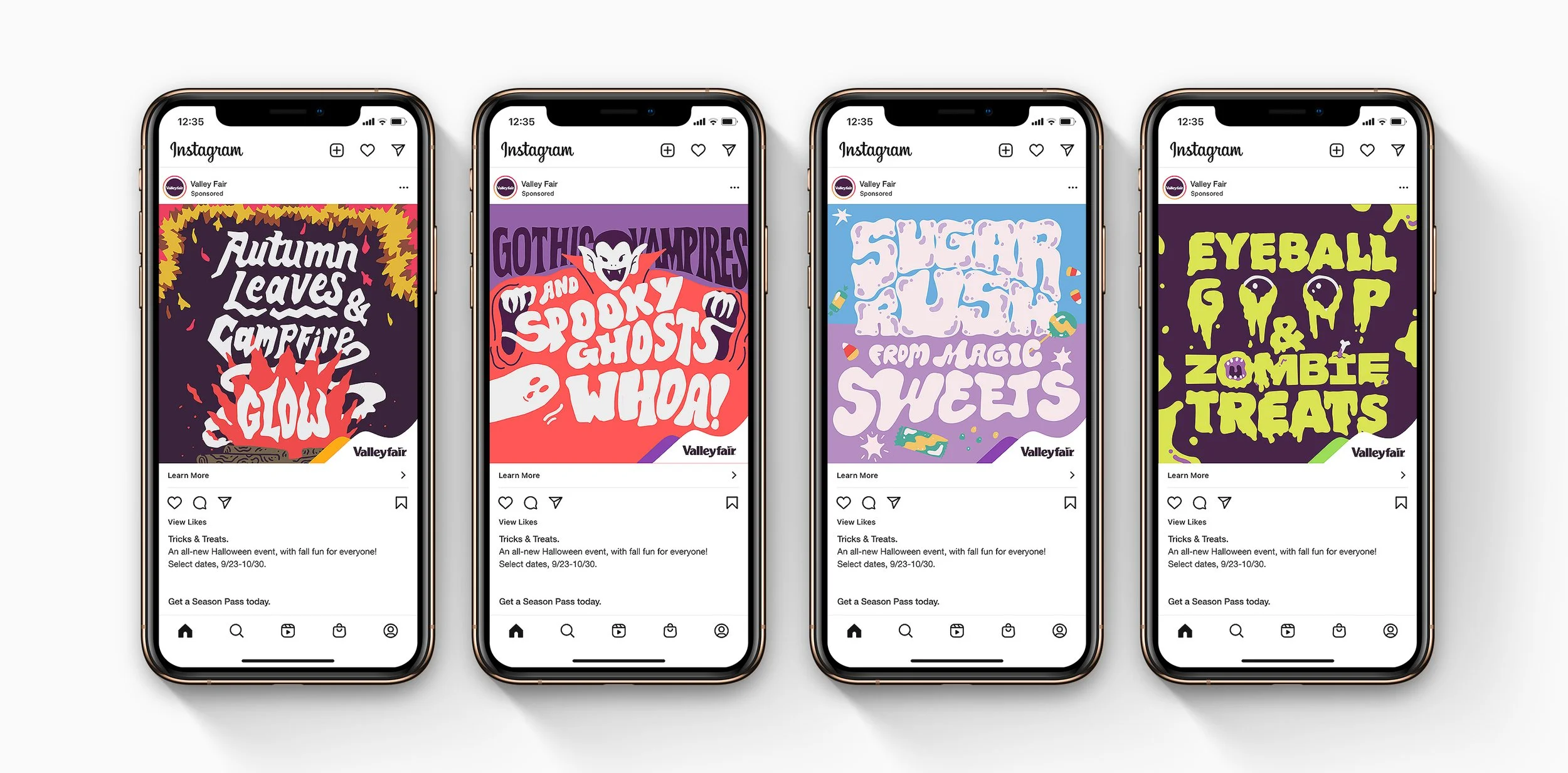 To launch the all-new fall event, Tricks and Treats at Valley Fair amusement park, we developed a playful illustrative style and rhyme scheme to capture the sense-stimulating spirit of fall.